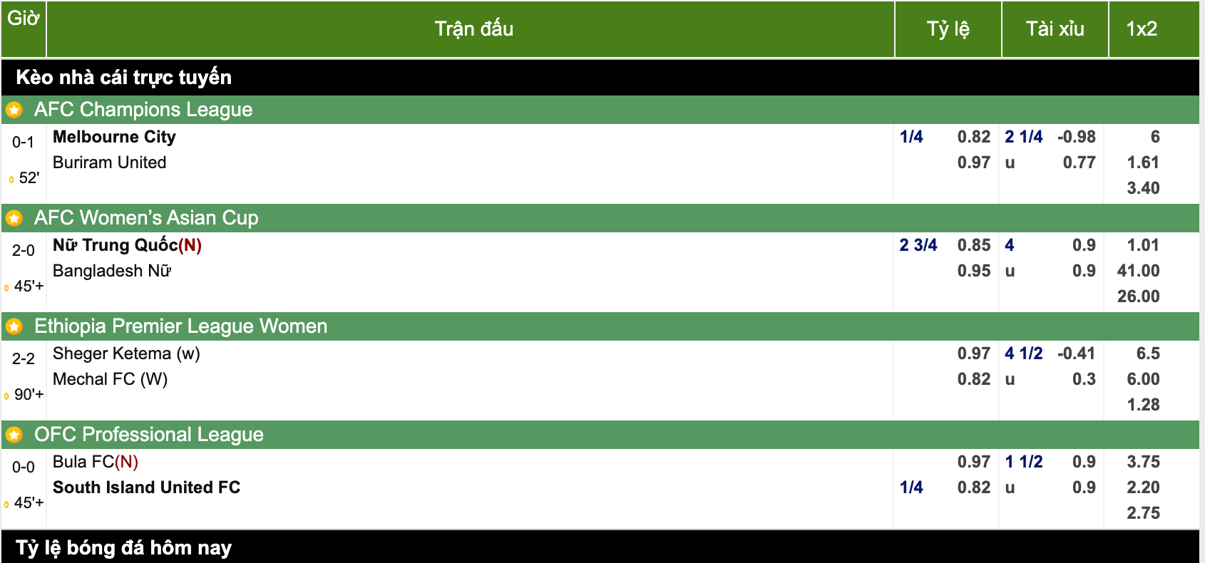 Tỷ lệ kèo nhà cái Bongdalu là thông tin về các loại kèo cá cược từ những nhà cái hàng đầu, bao gồm các loại kèo phổ biến như kèo châu Á, kèo châu Âu, kèo tài xỉu và nhiều loại kèo khác. Tất cả dữ liệu kèo được cập nhật theo thời gian thực, giúp người dùng nắm bắt được sự thay đổi kèo nhanh chóng và chính xác.